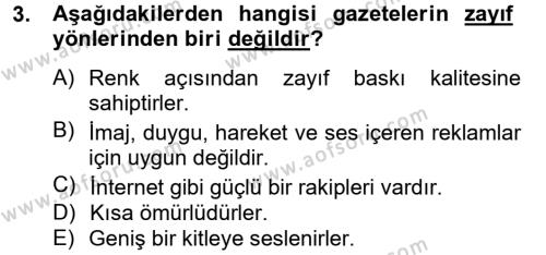 Aöf Medya ve Reklam dersi 2012 - 2013 yılı (Vize) Ara sınavı sorularını çözerek sınavlara daha hazırlıklı olabilirsiniz. Medya ve Reklam dersi vize (ara sınavı), final (dönem sonu sınavı), tek ders, üç ders ve yaz okulu sınav ve sorularına Medya ve Reklam Dersi sayfasından ulaşabilirsiniz.